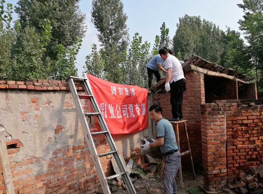 貧困戶魏澤美家是博農乳業(yè)公司對口扶貧幫扶戶,公司黨支部了解到魏澤美家中廁所年久失修,給其生活造成不便的實際情況,經過研究,決定發(fā)揮公司支部黨員水電、建筑等人才優(yōu)勢,組織黨員直接參與其廁所整修工作。30日下午,乳業(yè)公司黨員12人克服天氣炎熱、工作環(huán)境條件復雜的多重困難,全身心投入到廁所整修工作中,有的撤除房頂,有的焊接梁架,有的開挖水溝,有的連接電路,用整整一下午時間,完成了房頂撤除更換、連通水電的任務,幫扶工作受到貧困戶魏澤美的交口稱贊。